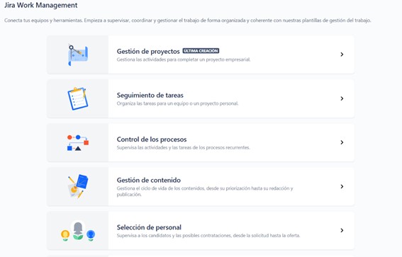 Não há dúvida de que é um instrumento concebido para a gestão do trabalho diário, quer como projecto, quer ao nível das tarefas internas. Para aqueles que não sabem como funciona o Jira, funciona por projectos. Desta forma, o mesmo departamento pode ter mais do que um projecto dependendo das suas necessidades e pode ligá-los para partilhar certas tarefas. Para criar projectos, encontraremos uma grande variedade de modelos predefinidos para cada ocasião ou podemos criar o nosso próprio projecto criando os fluxos necessários e personalizados. A título de exemplo, mostro-vos alguns modelos: